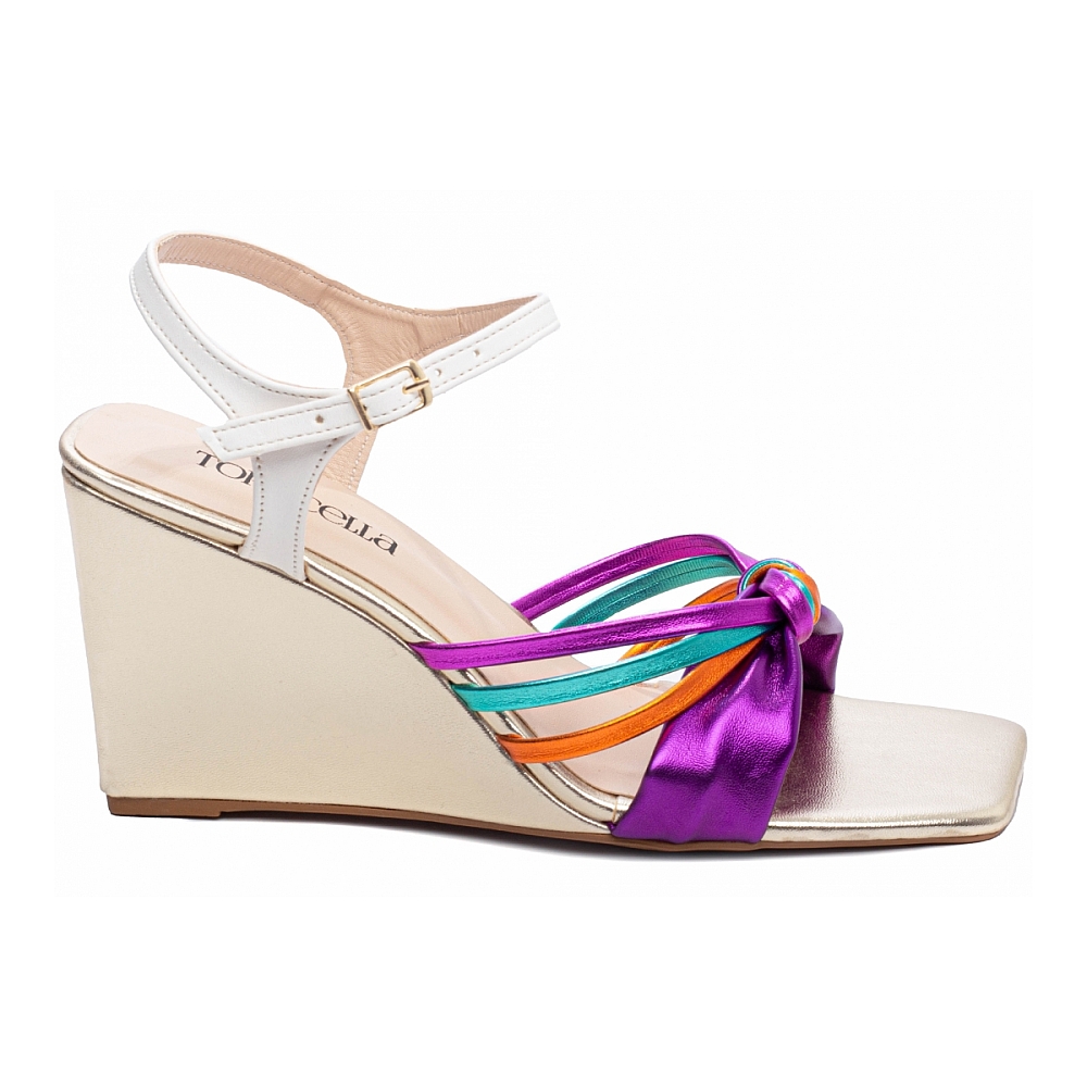 Material: Napa Branco, Napa Metalizado Roxo, Laranja, Verde e Rosa; Enfeite: Fivela de Ajuste na cor Dourado; Palmilha: 4 mm de Espessura, Espuma em EVA, Revestida em Napa Branco e Taloneira Napa Metalizado Dourado; Plataforma: Traseiro / Salto com 9 cm de Altura, Revestido em Napa Metalizado Dourado; Solado de TR na cor Bege.